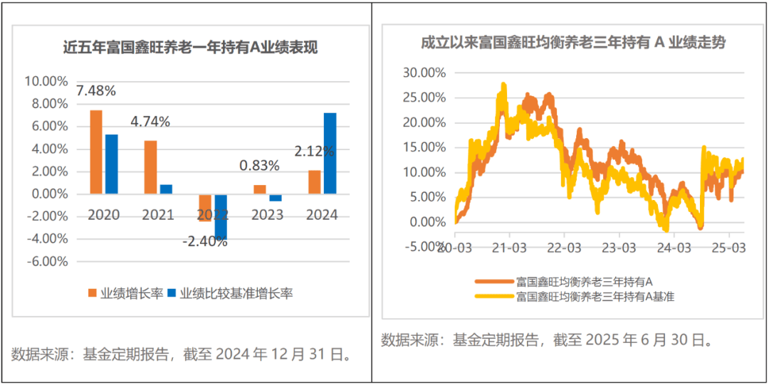 注:富国鑫旺稳健养老目标一年持有期混合(FOF)A成立于2018/12/13,业绩比较基准为中债综合全价指数收益率*80%+沪深300指数收益率*20%。近5个完整年度(2020-2024)的基金份额净值增长率(及同期业绩比较基准收益率)为7.48%(5.32%),4.74%(0.87%),-2.4%(-4.06%),0.83%(-0.64%),2.12%(7.24%),数据来自基金定期报告,截至2024/12/31。期间基金经理变动情况:陈曙亮(2018/12/13-2019/06/11)、张子炎(2019/05/31至今)。基金收益率不代表投资者实际收益率,基金份额净值仅为每份额基金产品的净资产。基金历史业绩不构成对未来业绩的保证。富国鑫旺均衡养老目标三年混合发起式(FOF)A成立于2020/03/23,业绩比较基准为沪深300指数收益率*50%+中债综合全价指数收益率*50%。近4个完整年度(2021-2024)的基金份额净值增长率(及同期业绩比较基准收益率)为5.84%(-1.21%),-12.07%(-10.8%),-2.23%(-4.68%),0.17%(10.35%),数据来自基金定期报告,截至2024/12/31。期间基金经理变动情况:张子炎(2020/03/23至今)。基金收益率不代表投资者实际收益率,基金份额净值仅为每份额基金产品的净资产。基金历史业绩不构成对未来业绩的保证。