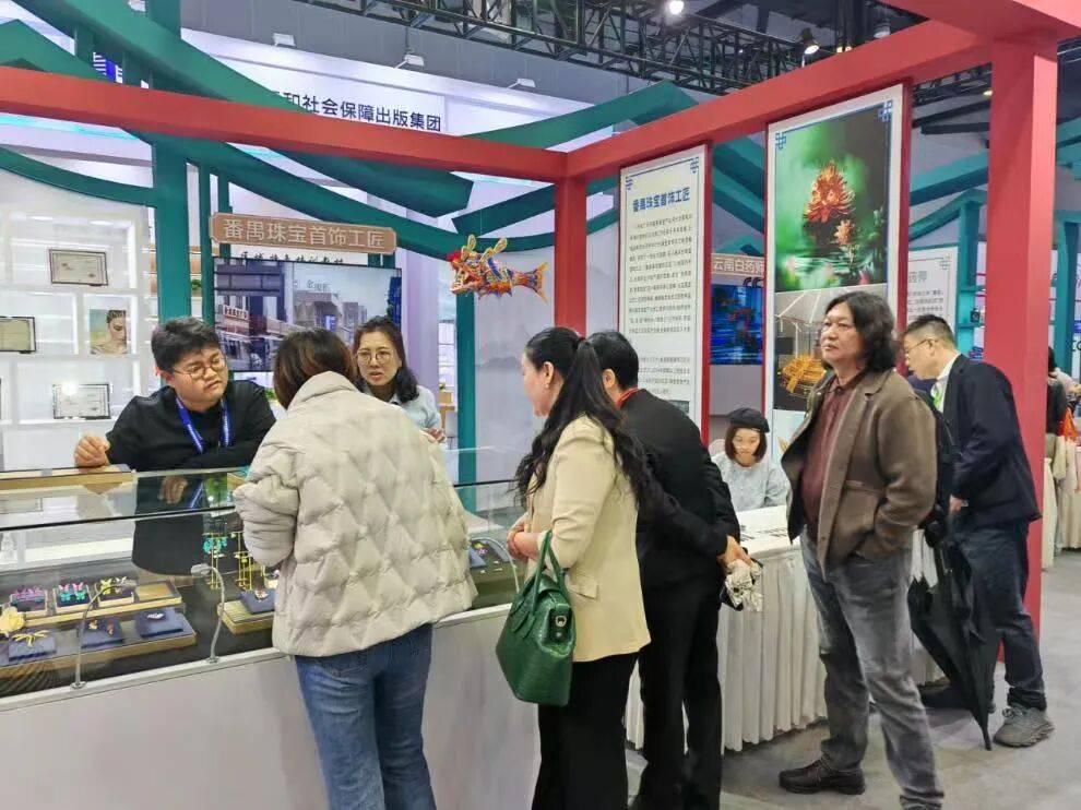 第三届全国劳务协作暨劳务品牌发展大会特色主题展区,“番禺珠宝首饰工匠”产品吸引群众驻足观看