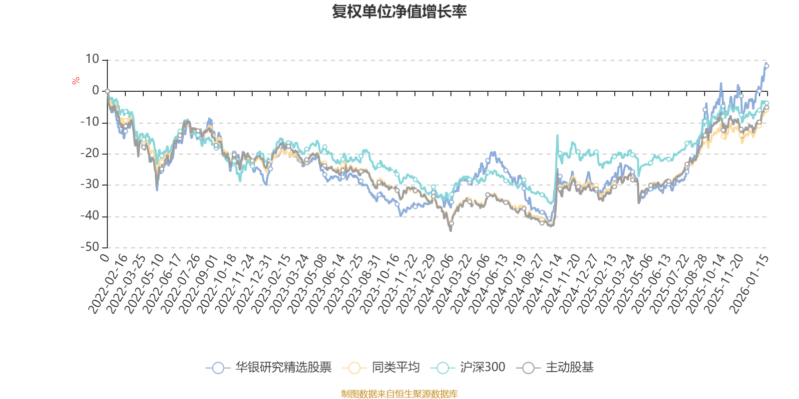 截至1月15日,华银研究精选股票近三个月复权单位净值增长率为11.87%,位于同类可比基金26/121;近半年复权单位净值增长率为50.98%,位于同类可比基金12/121;近一年复权单位净值增长率为57.12%,位于同类可比基金24/119;近三年复权单位净值增长率为36.95%,位于同类可比基金26/89。