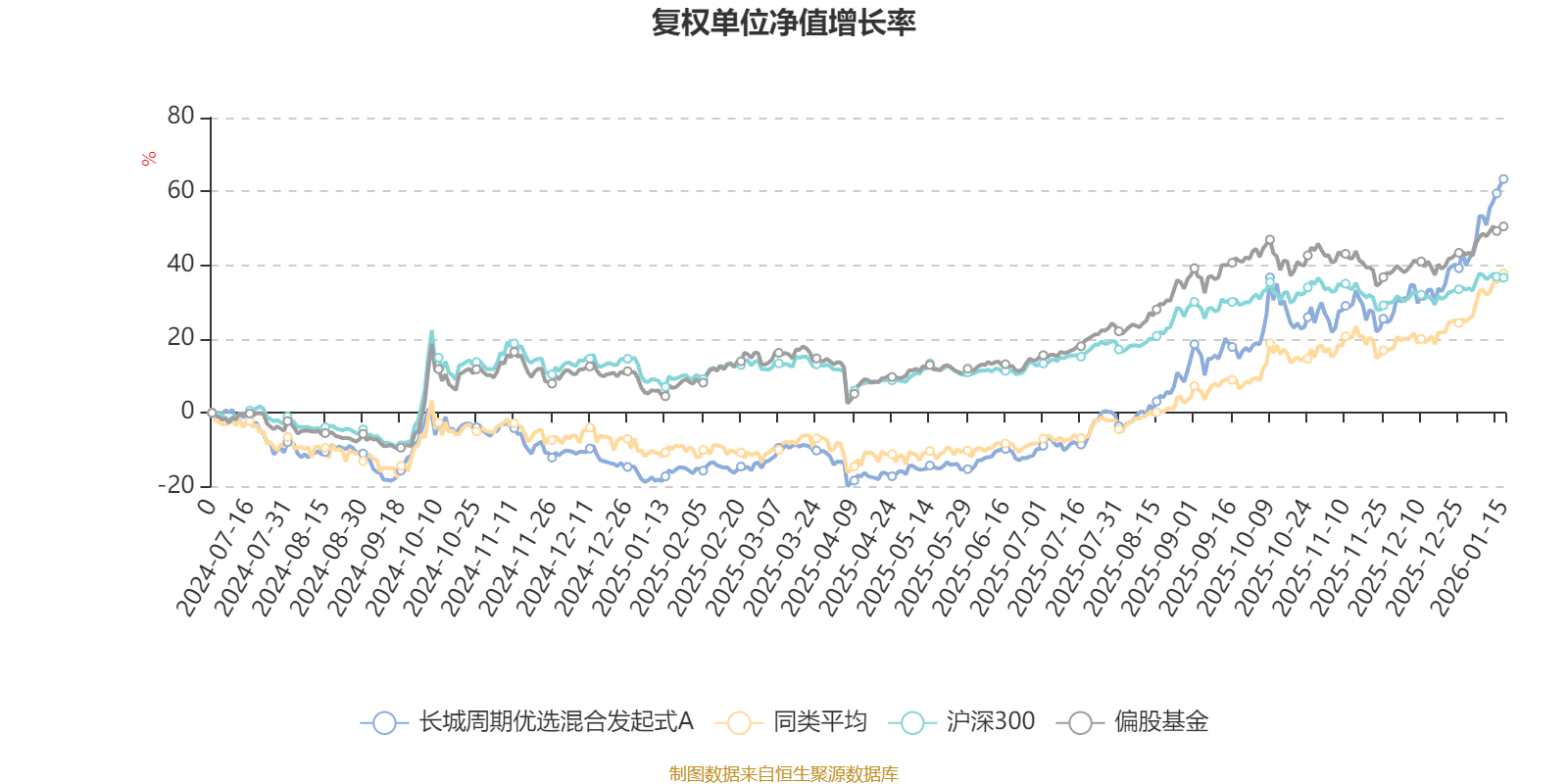 截至1月15日,长城周期优选混合发起式A近三个月复权单位净值增长率为25.28%,位于同类可比基金9/49;近半年复权单位净值增长率为78.62%,位于同类可比基金8/49;近一年复权单位净值增长率为94.81%,位于同类可比基金4/44。