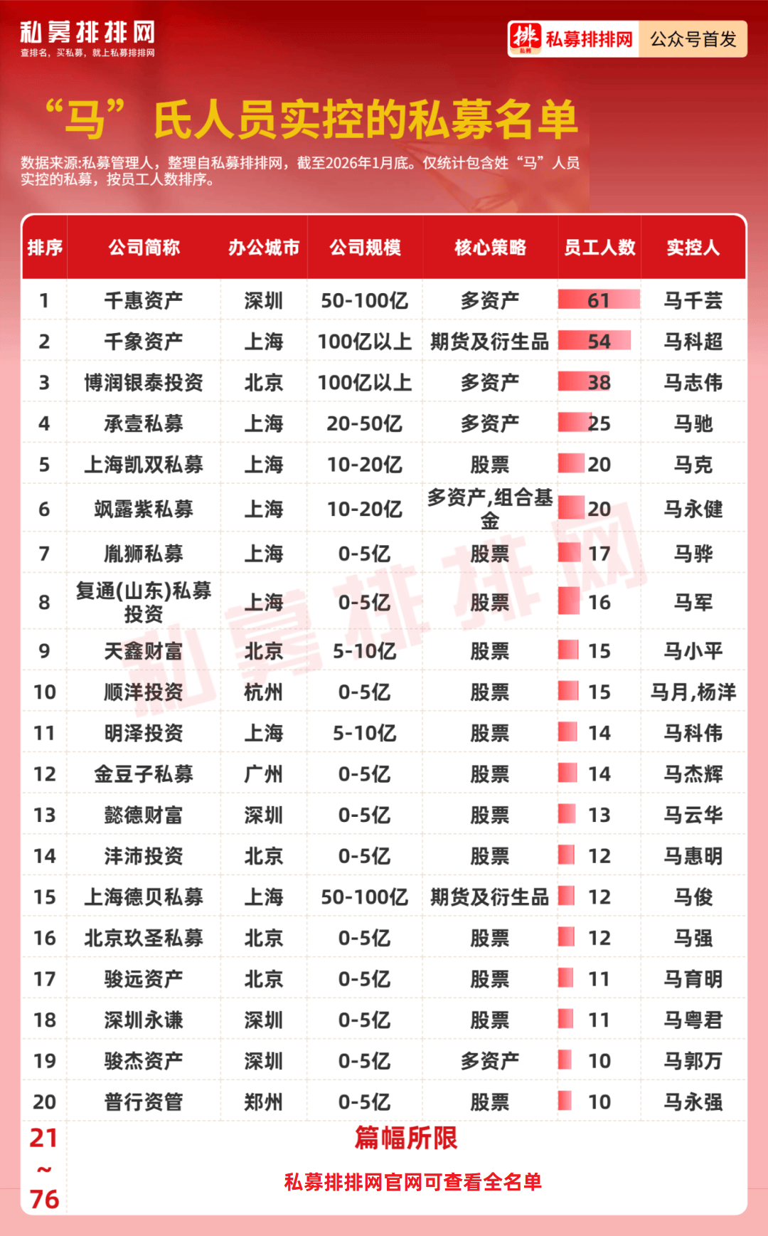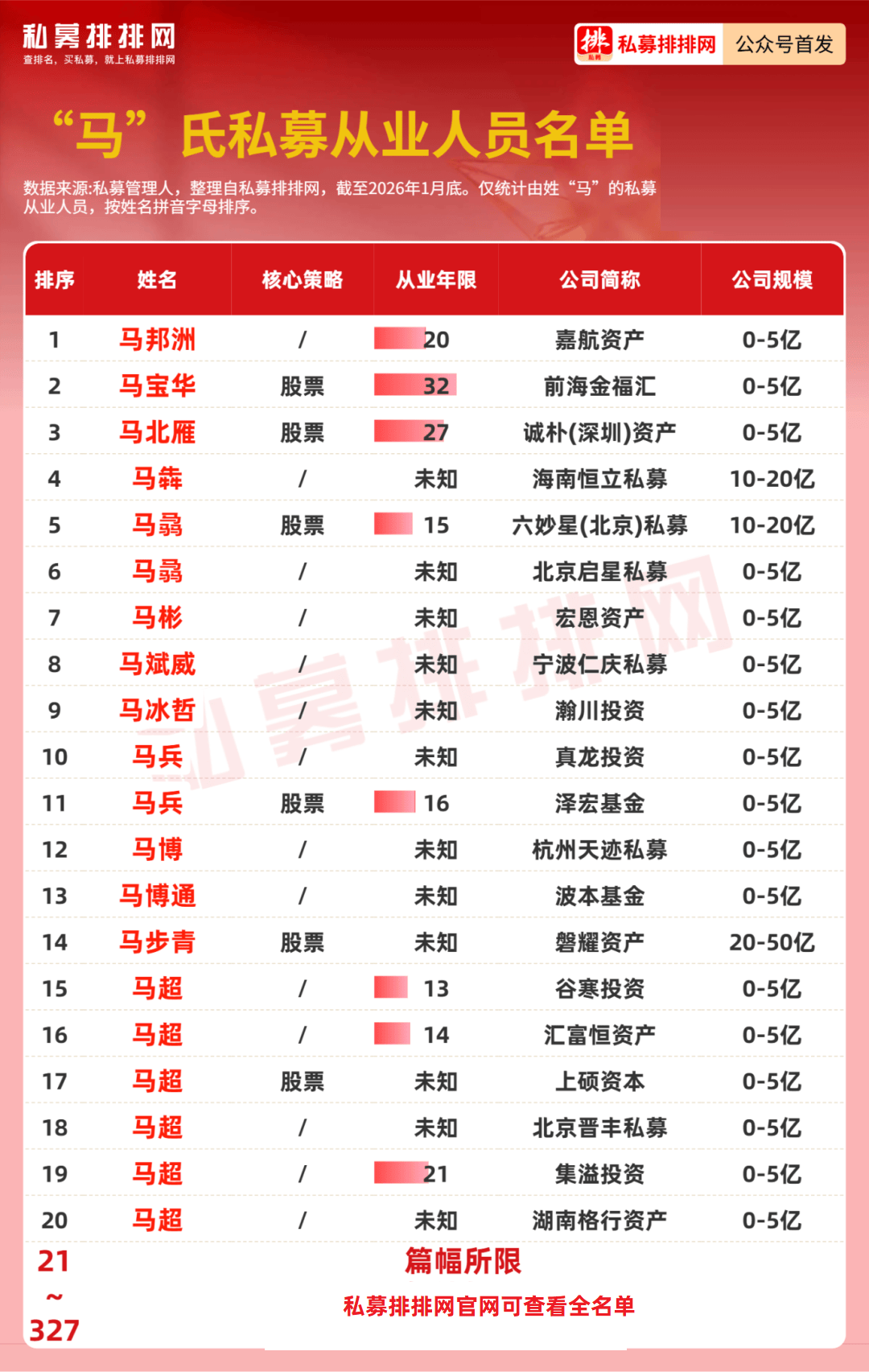 私募排排网数据显示,截至1月底,姓氏为“马”的私募从业人员共有327位,姓氏为“马”的公司实控人有76位。来自百亿私募的有8位,其中担任基金经理职位的仅有6位,分别是:博润银泰投资马志伟、千象资产马科超、通怡投资马靖翔、千衍私募马双杰、林园投资马志宏、灵均投资马志宇等。其中,马科超、马志伟均为公司实控人。
