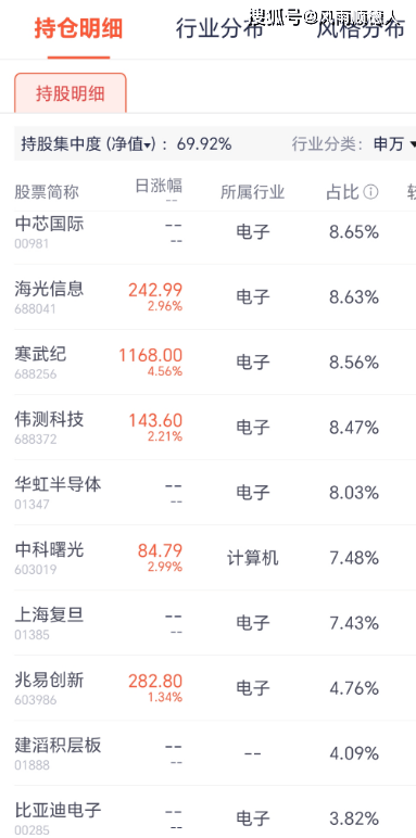 该基金前十大持仓中寒武纪-U涨幅较大,前十持仓占总持仓的69.92%,基金风格偏向半导体行业,基金净值相对跑赢市场(属于半导体行业芯片制造方向的跨市场主动型混合基金)【基金规模0.49亿元】。净值增长较差的是国泰优选领航一年持有(FOF),