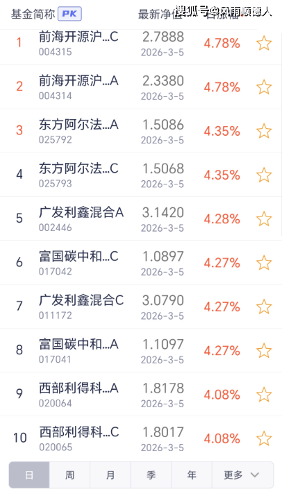 5日开放式基金净值增长排名前10的基金分别是:前海开源沪港深新硬件C、前海开源沪港深新硬件A、东方阿尔法科技甄选混合发起A、东方阿尔法科技甄选混合发起C、广发利鑫灵活配置混合A、富国碳中和混合C、广发利鑫灵活配置混合C、富国碳中和混合A、西部利得科技创新混合A、西部利得科技创新混合C。