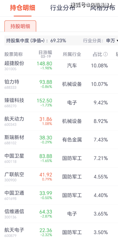 该基金前十大持仓中超捷股份、铂力特、臻镭科技、航天动力、斯瑞新材、中国卫星、广联航空、中国卫通、信维通信、航天电子涨幅较大(3月18号),前十持仓占总持仓的69.23%,基金风格偏向军工行业。基金净值相对跑赢市场(属于军工行业商业航天方向的主动型混合基金,至于为啥今天才出昨天的净值,我不知道)【基金规模1.17亿元】。净值增长较差的是西部利得策略优选混合A,