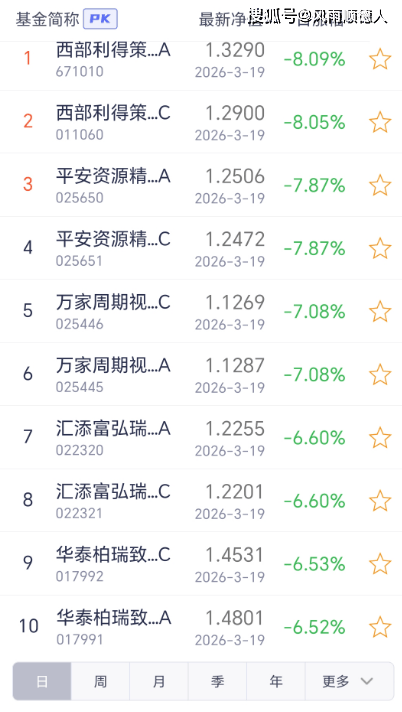 19日开放式基金净值增长排名后10的基金分别是:西部利得策略优选混合A、西部利得策略优选混合C、平安资源精选混合发起式A、平安资源精选混合发起式C、万家周期视野股票发起式C、万家周期视野股票发起式A、汇添富弘瑞回报混合发起式A、汇添富弘瑞回报混合发起式C、华泰柏瑞致远混合C、华泰柏瑞致远混合A。