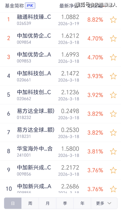 19日开放式基金净值增长排名前10的基金分别是:融通科技臻选混合发起式C、中加优势企业混合C、中加优势企业混合A、中加科技创新混合发起式A、中加科技创新混合发起式C、易方达全球优质企业混合(QDII)C(美元现汇份额)、易方达全球优质企业混合(QDII)A(美元现汇份额)、华宝海外中国成长混合、中加新兴成长混合C、中加新兴成长混合A。