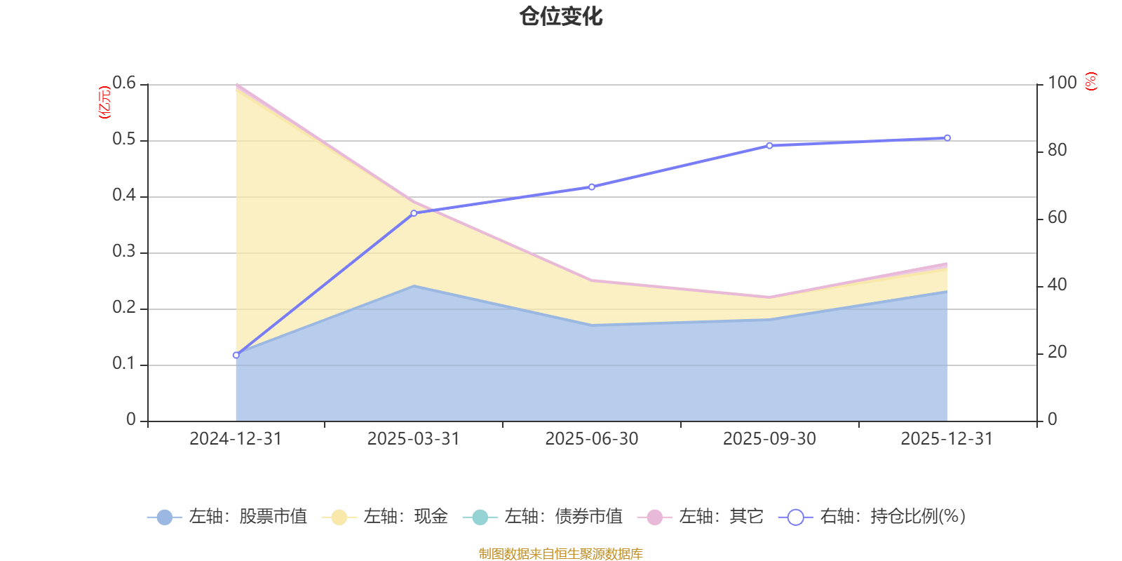 据定期报告数据统计,成立以来平均股票仓位为63.27%,同类平均为84.04%。2025年末基金达到84.03%的最高仓位,2024年末最低,为19.48%。